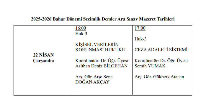 SEÇİMLİK DERSLERE İLİŞKİN ARA SINAV PROGRAMI (BAHAR DÖNEMİ)